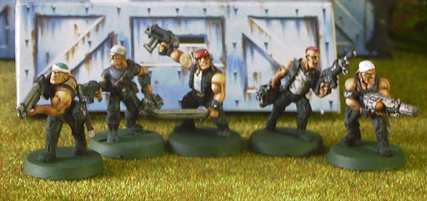 | まるまのアーミーの指揮官・サンダース大佐と、そのボディガード達です。 せっかくの司令部なので、ちょっと個性あるキャラにしたいと、多少コンバージョンしてみました。 重武装なのでコストは高いのですが、大佐の戦闘能力も相まって、なかなか単独でも強い部隊です。 |