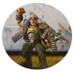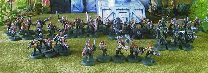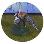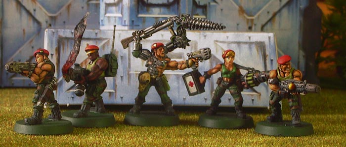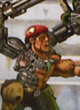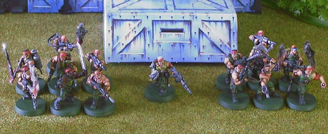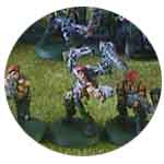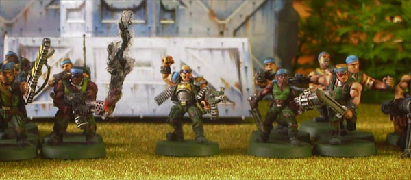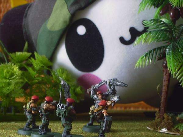 | アーミーに必ず入れなければならないトループの一画、歩兵小隊です。 火炎放射器系をフルに配備し、ジャングルの茂みから敵に襲いかかる…という役目の部隊ですね。 隊長の大尉は、すでに片腕をサイバードリル化した老練の兵士です。 |
