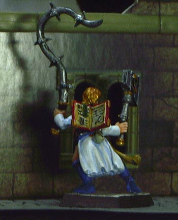 こちらは背後です。 背負っているのは、シグマーの聖典ですね。 モードハイムに起こった異変の予言がされているみたいです。 パっと見におさげが隠れちゃうのが、少し…残念かな? シグマーに超気に入られているトルーデは、ワードストーンの力で 死者すら復活させるという、究極の聖女なのです。 しかも腕っぷしは誰より強い! ラットオーガを殴り倒し、ヴァンパイアをビシバシ鞭打つぞ! 強いぞトルーデがんばれトルーデ、モードハイムの平和はキミが取り戻すんだ! |